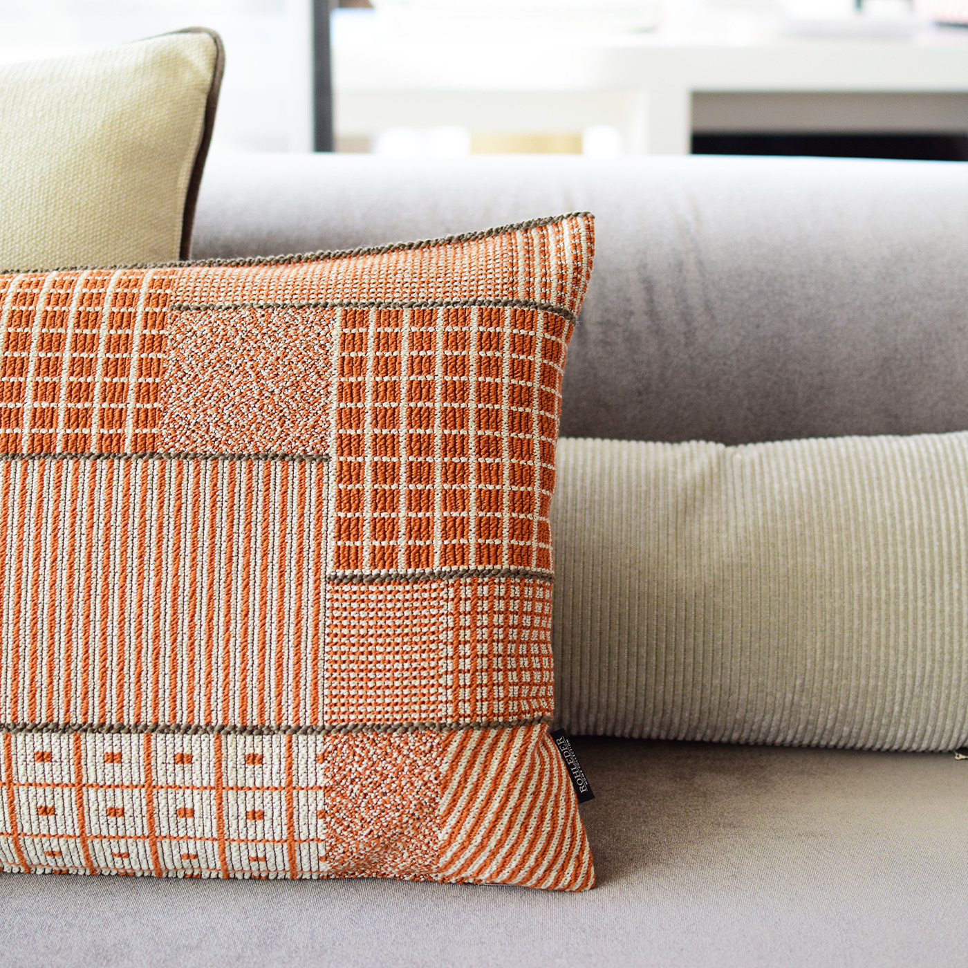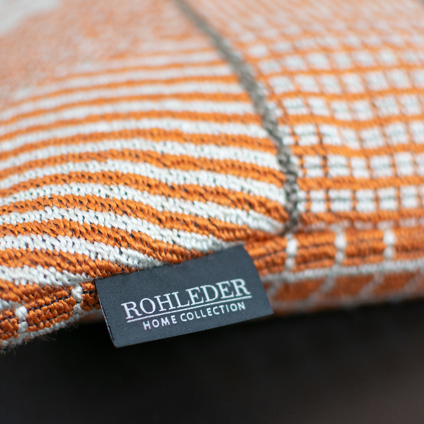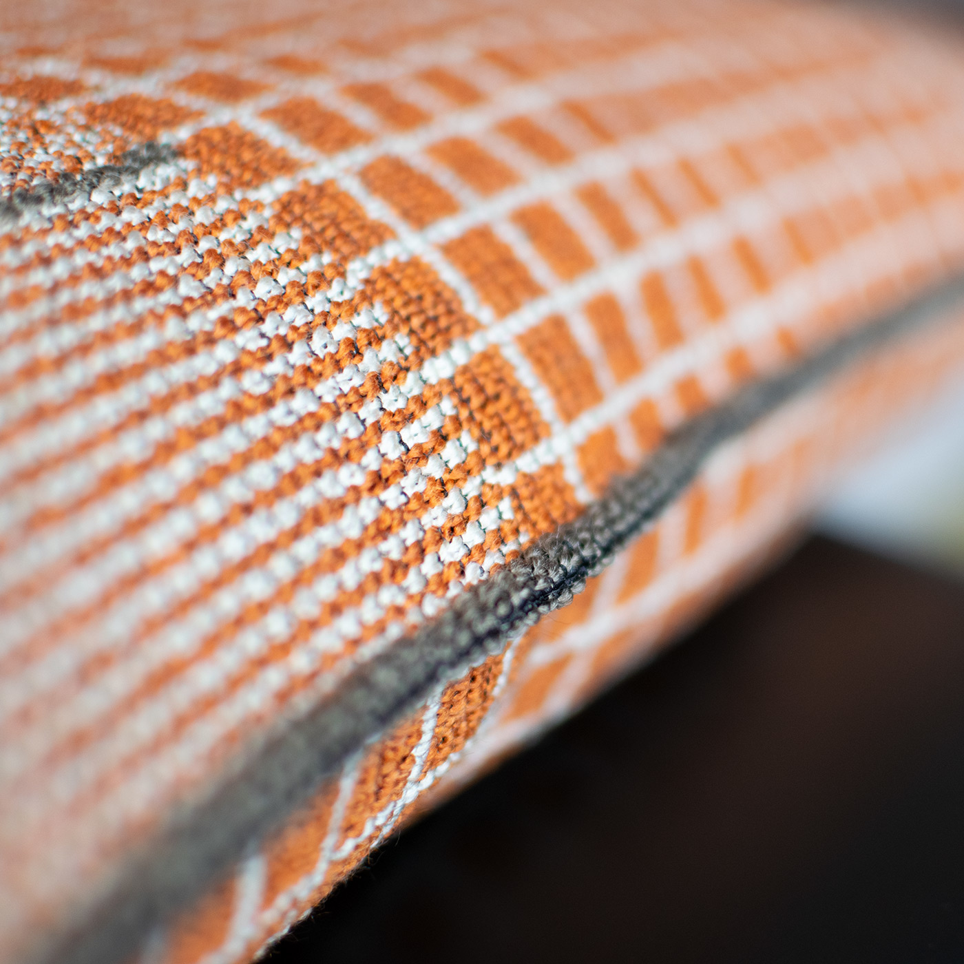 Alles hat zwei Seiten – auch Kissen Doubleface mit einer raffiniert abgesteppten Paspel auf der Oberseite. In der Farbe Artist machen frisches Orange, Weiß und Braun das streng grafische Muster zu einem echten Eyecatcher.