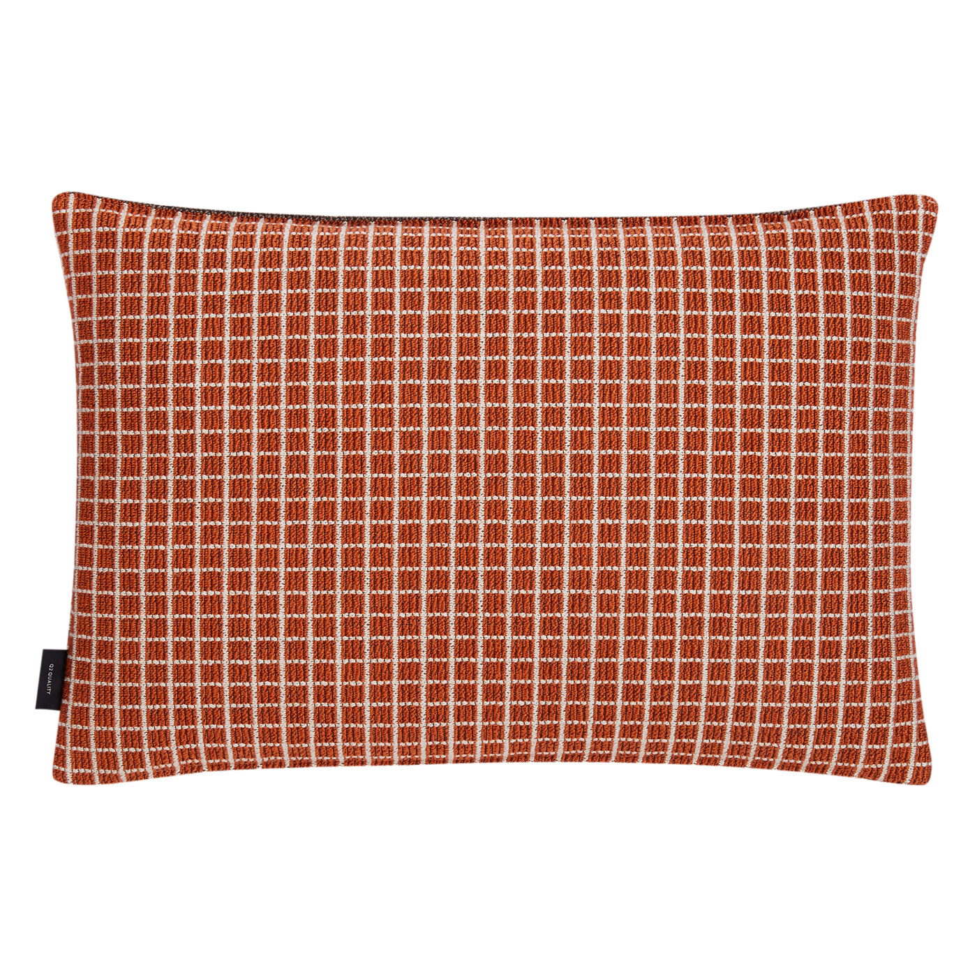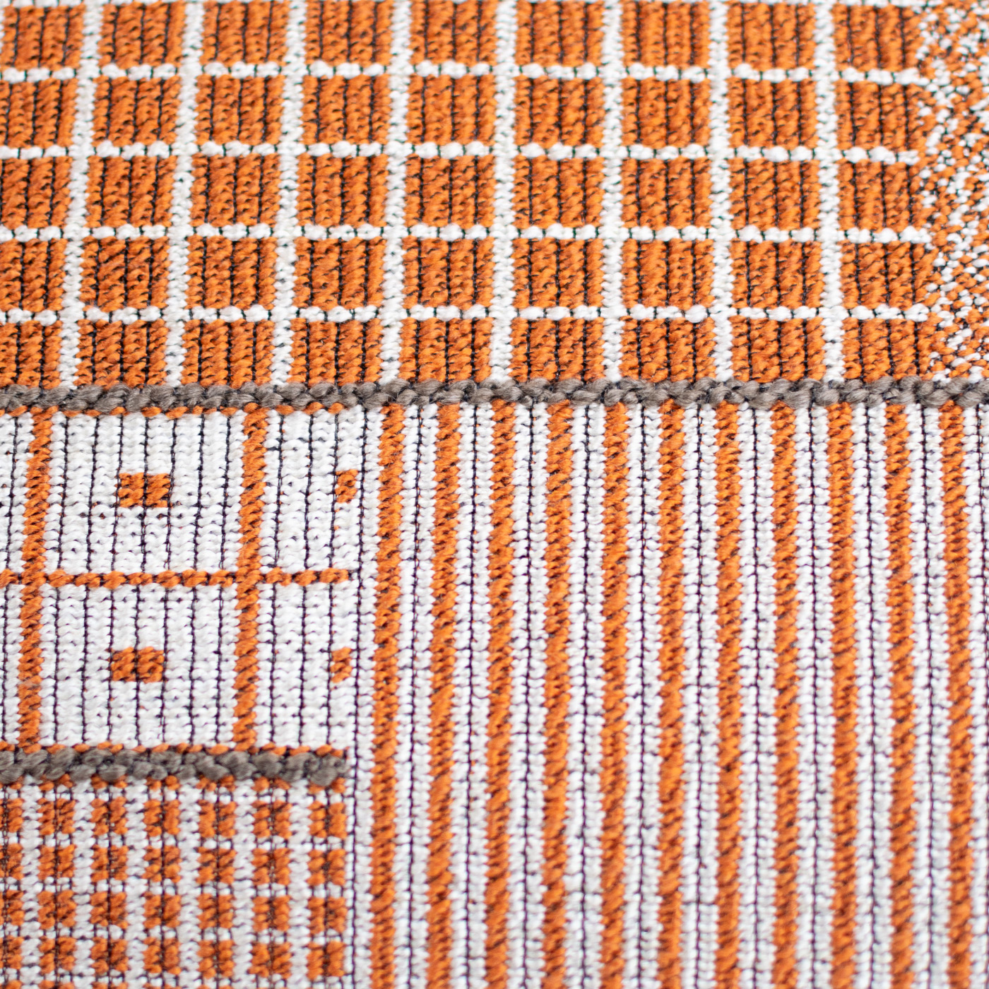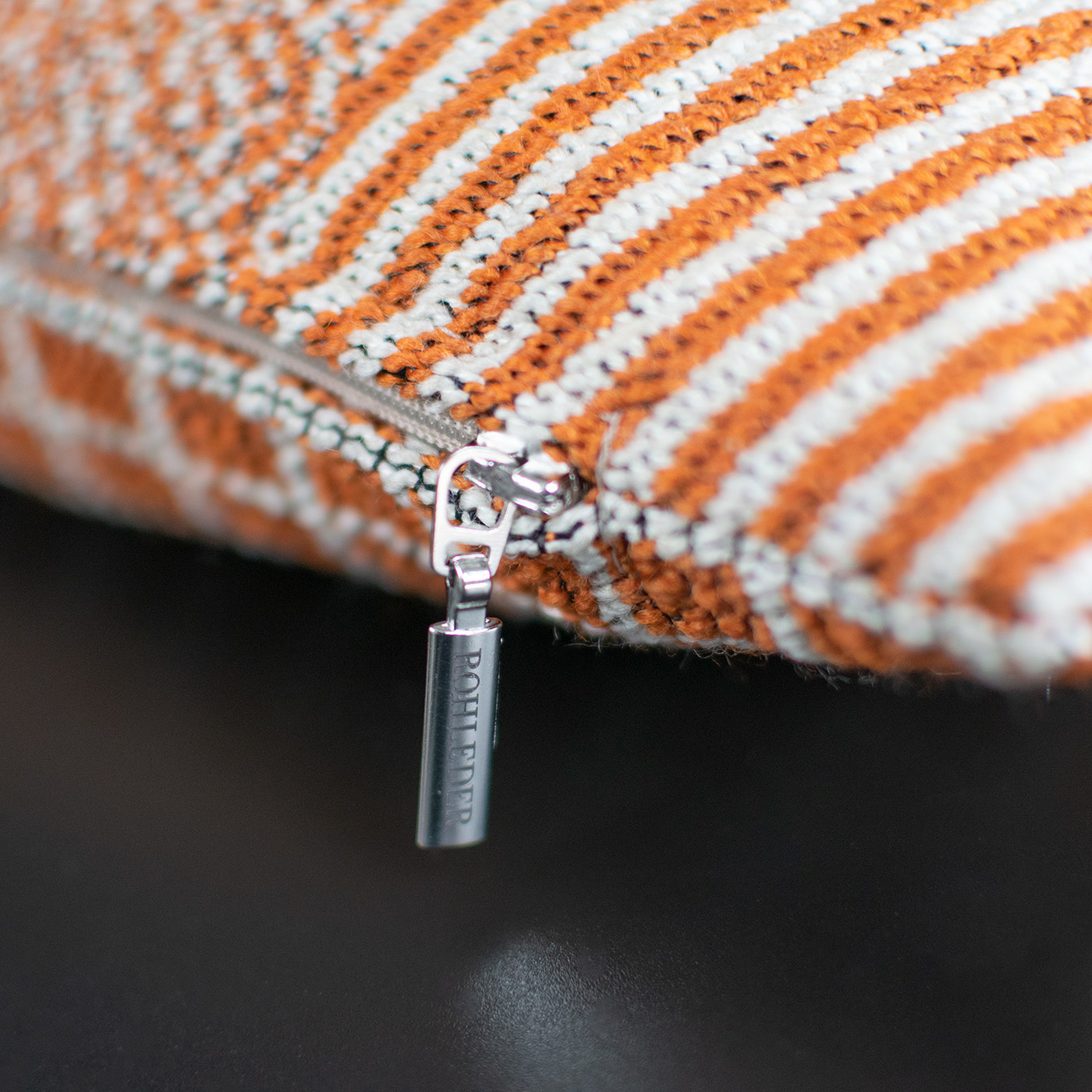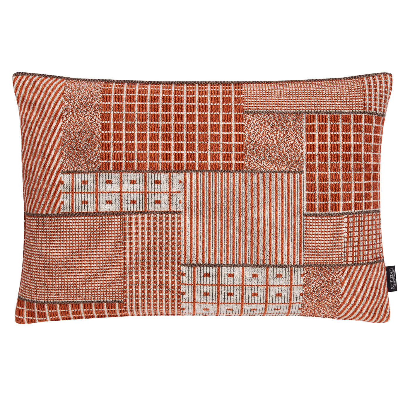 Alles hat zwei Seiten – auch Kissen Doubleface mit einer raffiniert abgesteppten Paspel auf der Oberseite. In der Farbe Artist machen frisches Orange, Weiß und Braun das streng grafische Muster zu einem echten Eyecatcher.